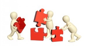 Conceptual image – success of teamwork. Three puppets with puzzles. Isolated on white background