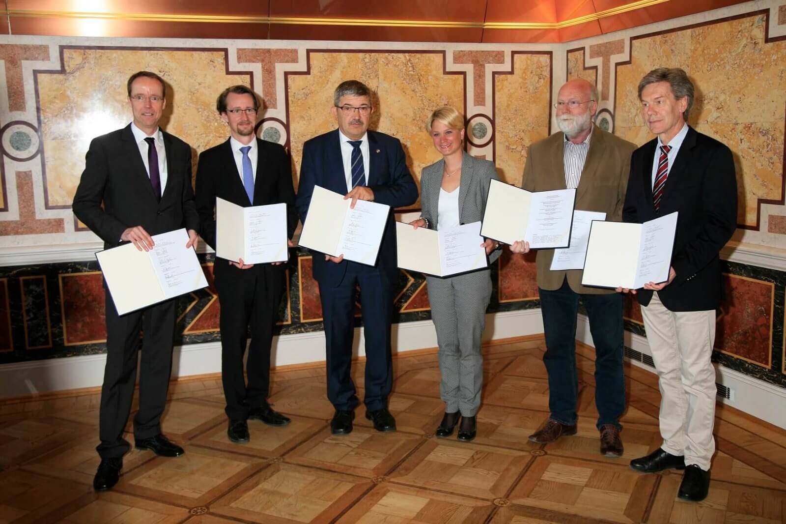 Unterzeichneten die Kooperationsvereinbarung (v.l.): Der Chef der Staatskanzlei Dr. Christian Frenzel, Bildungsminister Mathias Brodkorb, Innenminister Lorenz Caffier, Sozialministerin Birgit Hesse, Landesdatenschutzbeauftragter Reinhard Dankert und der Direktor der Medienanstalt Dr. Uwe Hornauer.