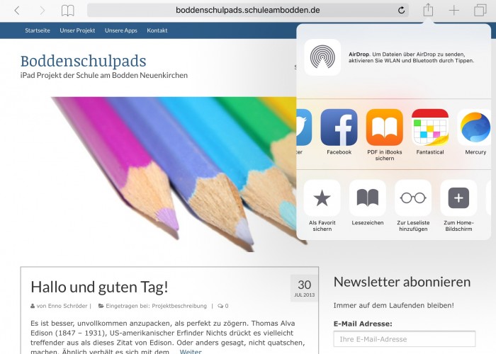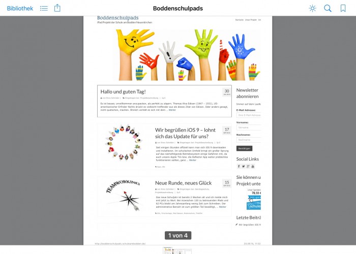 Auf meinem Air 2 macht sich auf jeden Fall Splitview als Neuerung positiv bemerkbar. Sicher ist das kommende iPad Pro aufgrund der Bildschirmgröße prädestinierte für den parallelen Betrieb zweier Apps, brauchbar ist diese Funktion für mich aber durchaus, da ich oft mit 2 Anwendungen gleichzeitig arbeite. Eine sinnvolle Neuerung, die freilich nur Kollegen mit einem iPad Air 2 nutzen können. Den Schülern bleibt dies aufgrund der Hardwarevoraussetzungen auf ihren iPads vorenthalten. Dafür ist eine weitere Neuerung interessant. Ab sofort kann jeder Anwender ohne Zusatz-App ein Pdf-Dokument aus Safari heraus erstellen. Dies ist für die Recherche im Internet oftmals sinnvoll, da man sich in iBooks mehrere Dokumente unter einer Rubrik zusammenstellen kann. Gleichzeitig ist bei umfangreicheren Arbeiten z.B. unseren Jahresarbeiten das Anlegen eines Quellenarchivs möglich.
